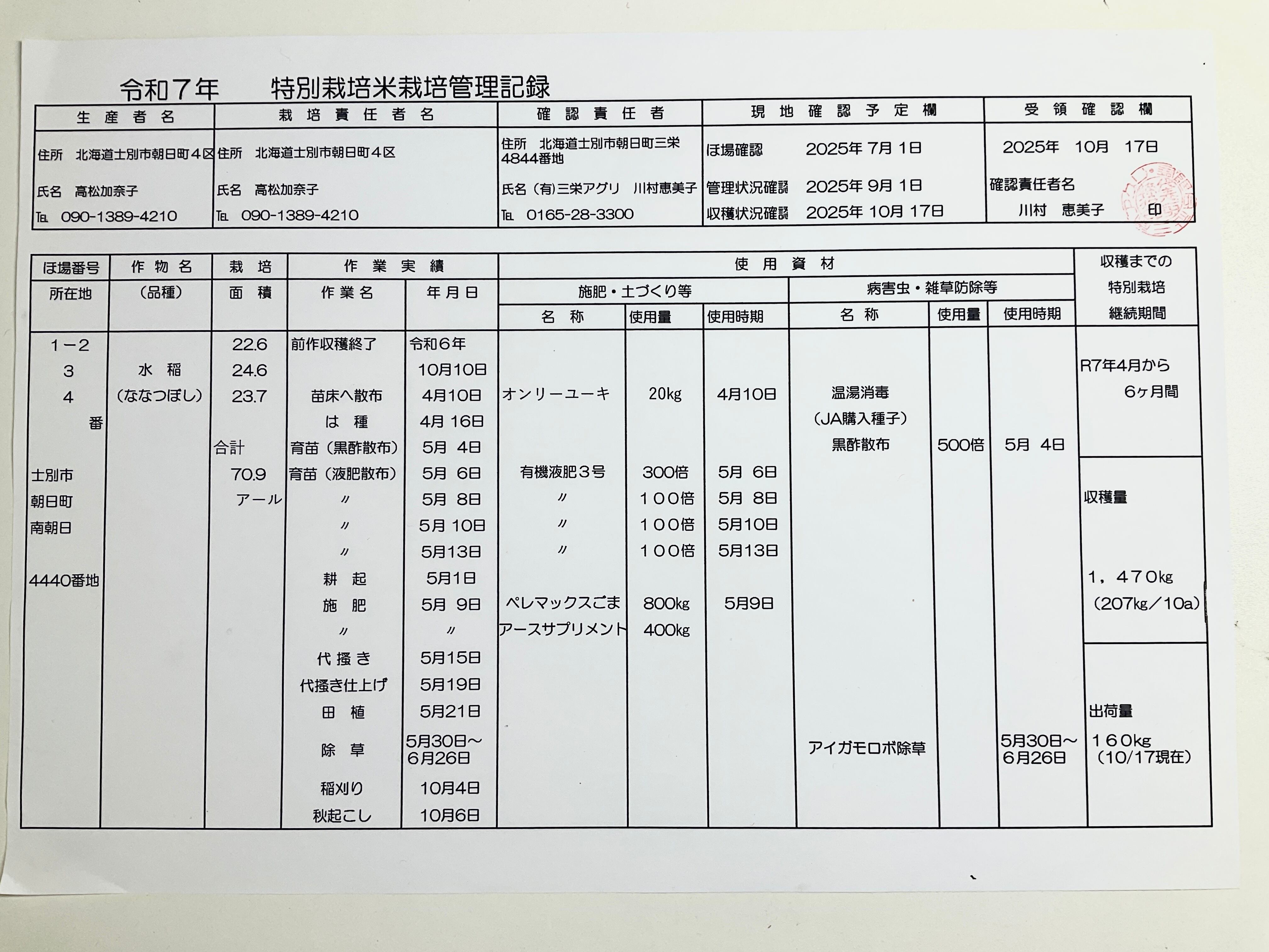 私たちは、お客様に安心して召し上がっていただけるお米をお届けするために令和7年度新米から、農薬・化学肥料不使用の「特別栽培米」を作っています。このページでは、農林水産省「特別栽培農産物に係る表示ガイドライン」に則り今年度の栽培管理記録・栽培計画書を掲載しています。